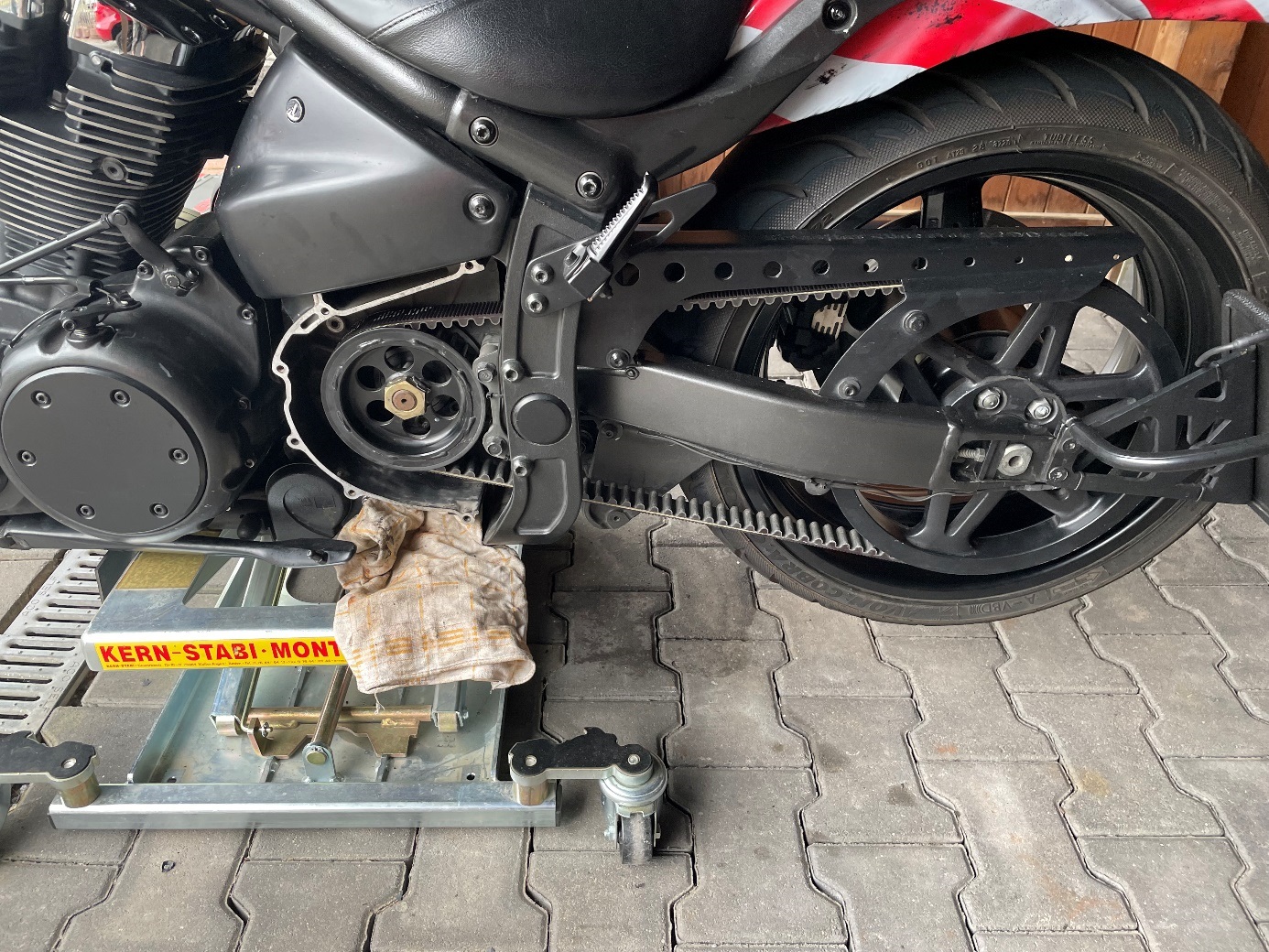 Warrior mit Spannbänder gesichert, Auspuff demontiert, Deckel vom kleinen Pullyrad gelöst und gesehen das der Wellendichtring nicht leckt. Schön dachte ich…