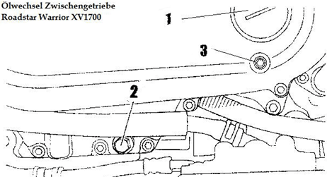 Die Ölablassschraube befindet sich unter dem großen, rechten, ovalen Seitendeckel (2). Die Kontrollschraube (3) ist unter der Getriebeöleinfüllschraube (1) am Seitendeckel.