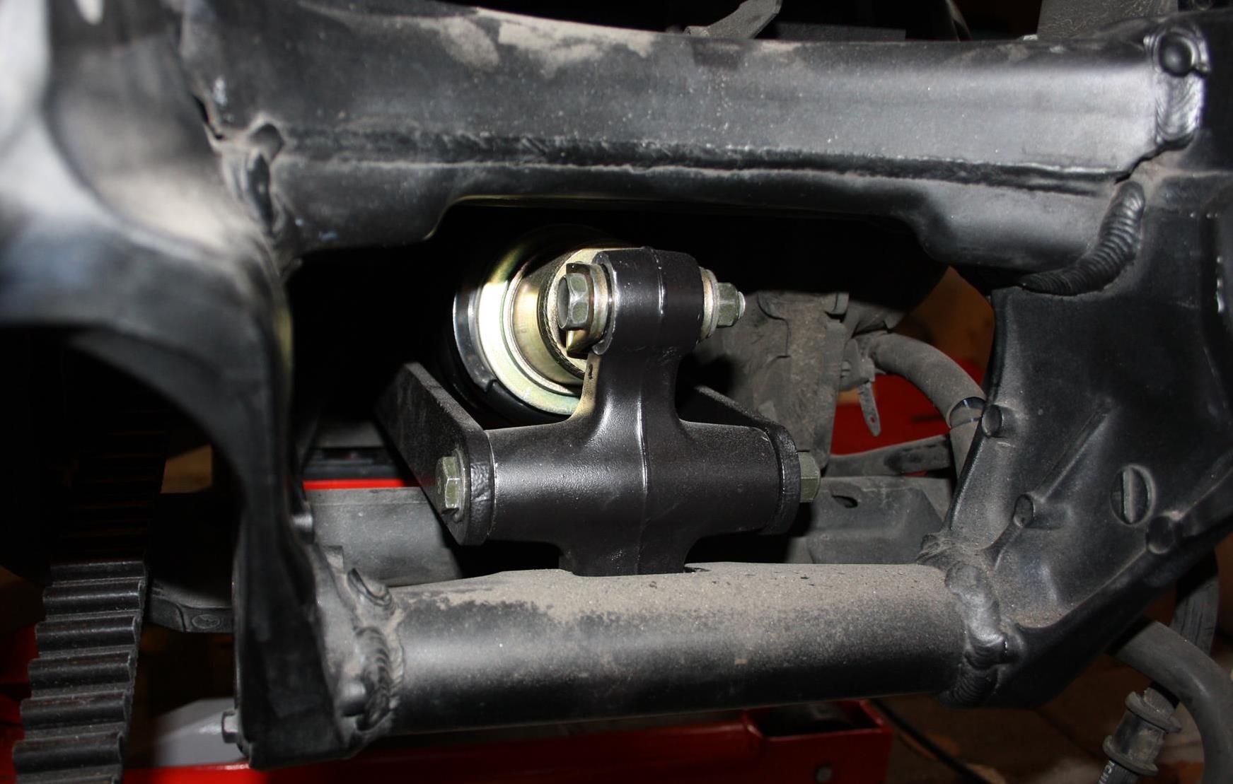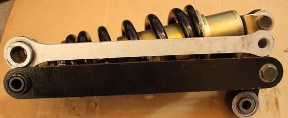 So sieht das Federbein im eingebauten Zustand aus. An der unteren Öse des Umlenkhebels wird mittels eines Bolzens die Schwinge montiert. Umlenkhebel und