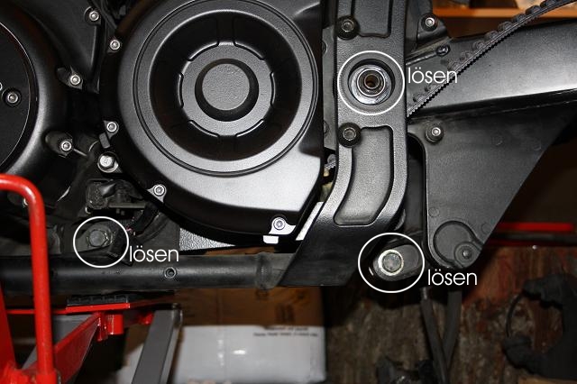3. Den Steckbolzen (27mm) lösen und herausziehen (der geht durch den Rahmen unterhalb der Soziusrasten).