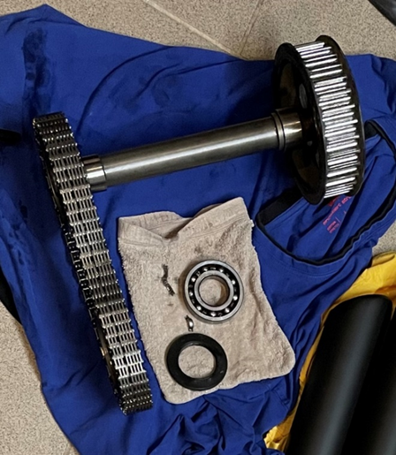 Wenn wirklich alles sauber ist, beginnst du mit den zwei Kugellagern links und rechts im Getriebegehäuse an der Warrior. Diese lassen sich übrigens sehr leicht wieder eintreiben. Im Lieferzustand sind sie eingefettet, dies habe ich komplett entfettet, verträgt sich nicht mit dem Getriebeöl und verstopft das Sieb. Beim Lager eintreiben sanft vorgehen und nicht zu stark zuschlagen. Denn korrekten Sitz kontrollieren. Auf der Pullyseite dann den neuen Wellendichtring einsetzen. Dann kann die komplette Welle mit Kette und Zahnrad wieder vorsichtig eingesetzt werden. Ich habe die Kette nicht gedreht, konnte keine Literatur dazu finden.