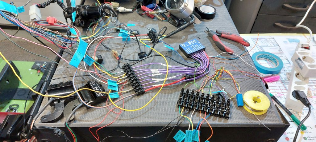 Gestern habe ich dann den alten, dicken Kabelstrang, der von der Lampe bis unter den Sitz führt, einmal aufgemacht und angefangen, die Steuerbox, Adapter und Taster zu verkabeln. Erst einmal zum Testen. Das hat sich als sehr praktikabel erwiesen. So hatte ich alle Kabel und Verbindungen auf dem Werkstattwagen liegen und hatte einen guten Überblick über alles. Die Verbindungen habe ich erst mal mit Lüsterklemmen gemacht, was beim hin- und her klemmen auch ganz praktisch war. Musste ich doch einiges erst mal austesten: