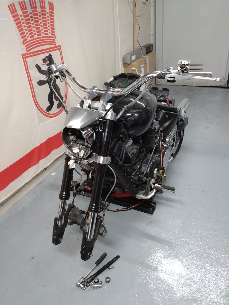 habe bis jetzt Lenker, Riser, Griffe, Blinker vorne u. hinten, Fender, Tacho Kmh... Danke für die Beschreibung!!! Umgebaut. Räder, Fender Halterungen und Abdeckung Bremsscheibe sind noch beim Hochglanzverdichten.
